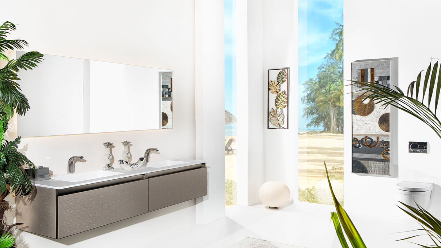 Aluminum frame with water resistant material, 100% durable to water and humidity, you can even wash the vanity, Adjustable cabinet hinges, German HETTICH drawer rails, Recyclable card board is used for packaging, Akzo Nobel paint is used, Bureau Veritas Certification.